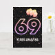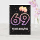 Party balloons and confetti on black background with the neon number 69 for a 69th birthday.