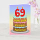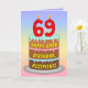 This fun and colorful birthday-themed greeting card design features a cartoon-style depiction of a three-tier birthday cake having numeral-shaped candles on top showing the number “69“, along with the message “HAPPY 69TH BIRTHDAY,”, and a custom recipient name. The background of the front has a multicolored pastel rainbow spectrum inspired gradient pattern. The inside has a personalized birthday greeting message, or could perhaps be cleared and left blank if a message is to be written by hand instead. A joyful, customizable birthday greeting card like this might be a fun way to deliver birthday greetings to somebody who is celebrating their sixty-ninth birthday. [~Z0000625]