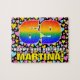 This exciting and bold birthday-themed jigsaw puzzle design features a large number “69” with a multicolored rainbow spectrum inspired gradient pattern, along with the message “HAPPY 69th BIRTHDAY,”, and a customizable recipient name. The background features a cheerful, colorful, loving hearts pattern. A fun, personalized birthday puzzle like this might be given to celebrate somebody’s sixty-ninth birthday. [~Z0000611]