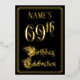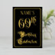 The front of this fancy and opulent foil sixty-ninth birthday celebration/party invitation design features the message “69th Birthday Celebration” in luxurious script-style text. It also has an editable name. The background of the front is colored black by default (although it can be customized to a different color). The back features personalized details about the event, such as the date, time, location, and any other relevant information. Elegant, ornate, editable invitations like these might be used to invite guests to a birthday party being held in celebration of somebody’s sixty-ninth birthday. [~Z0000589]