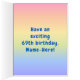This upbeat and cheerful birthday themed greeting card design features the number “69“ having a vibrant rainbow spectrum inspired gradient pattern, along with the message “Happy 69th Birthday,”, and a customizable recipient name. The inside has a custom birthday greeting message, or could perhaps be cleared and left blank if a message is to be written by hand instead. A vibrant, customizable birthday greeting card like this might be a fun way to send birthday greetings to somebody who is celebrating their sixty-ninth birthday. [~Z0000628]