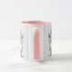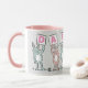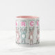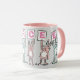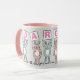 Fun mug for someone with a 6 Letter Name. Fun Pink and White mug with illustration of Rabbits in pink and blue. The rabbits are holding up cards to spell out the name. Example name is Darcee. Cute baby rabbits.