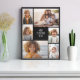 6 photos in an uneven pattern surround an opening for three lines of text. Use 2 square cropped photos and 4 vertical photos to make this work!