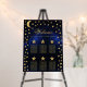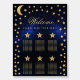 A 6 tables wedding seating chart for a celestial wedding theme, with the moon and star on a starry night blue background. The table numbers are written in big gold stars. The moon, the stars and text are golden. The word Welcome is written in an elegant calligraphic script.