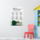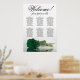 This beautiful wedding seating chart has six tables, each accommodating 10 guests, totaling 60 guests. The chart features a romantic design, showcasing a single long-stemmed deep emerald green colored rose delicately resting on its side and reflecting in a serene pool of water. The chart's title, rendered in elegant script calligraphy, warmly invites guests with "Welcome! Please find your table," while leaving sufficient space at the bottom for the couple's names and wedding date. This seating chart serves as a wonderful and practical way to greet your guests and assist them in finding their designated seats at the reception, exuding an air of charm and sophistication.