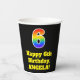 This exciting and fun birthday-themed paper cup design features a large number “6” with a rainbow spectrum gradient inspired pattern, along with the message “Happy 6th Birthday,”, and an editable name. The background is colored black. Vibrant, colorful paper cups like this might be fun to have at a birthday celebration/party being held in celebration of somebody’s 6th birthday. [~Z0000537]