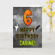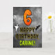 The front of this scary and spooky Hallowe’en themed birthday greeting card design features a large number “6”. It also features the message “HAPPY BIRTHDAY,”, plus a personalized name. There are also depictions of a ghost and a bat on the front. The inside features an editable birthday greeting message, or could perhaps be cleared and left blank if a message is to be written by hand instead. A customizable birthday card like this might be a fun way to send birthday wishes to somebody who is celebrating their sixth birthday and who was also born on October 31st (Halloween). [~Z0000547]