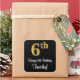 This stylish, elegant, and sophisticated birthday-themed square sticker design features a large ordinal number “6th” having an imitation/faux gold-like appearance, along with the birthday greeting message “Happy 6th Birthday,” and a personalized name in a script-style font. It also has a black-colored background. Stylish birthday-themed stickers like this might be used when giving a gift or present in celebration of somebody’s sixth birthday, or perhaps might be handed out to the attendees at a birthday celebration or party. [~Z0000517]