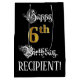 This fancy and opulent birthday-themed giftbag design features the message “Happy 6th Birthday,”, and a customizable recipient name. Part of the message is in a luxurious script-style text. The large number “6th” features a faux/imitation gold-inspired look pattern. The background is colored black. A birthday themed gift bag like this might be used when giving a gift or present in celebration of somebody’s sixth birthday. [~Z0000560]