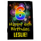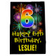 This fun, exciting, and colorful birthday themed gift bag design features a large number "6" with a rainbow spectrum gradient inspired pattern, along with the message "Happy 6th Birthday,", and a customizable recipient name. It also features a colorful background pattern inspired by the look of bursting celebratory fireworks. A birthday themed gift bag like this might be a fun way to wrap a gift or present being given to celebrate somebody’s sixth birthday. [~Z0000509]