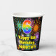 This exciting and colorful birthday paper cup design features a large number “6” with a rainbow spectrum gradient inspired pattern, along with the message “Happy 6th Birthday,”, and a personalized name. The background features a multicolored pattern inspired by the appearance of bursting celebratory fireworks. Vibrant, colorful paper cups like this might be fun to use at a birthday party/celebration being held to honor somebody’s 6th birthday. [~Z0000539]