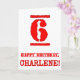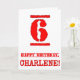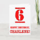 This fun birthday-themed greeting card design features a large red number “6” having a rubber stamp inspired look, along with the birthday greeting message “HAPPY BIRTHDAY,” and an editable name on the front. The inside has a customized birthday greeting message, or could perhaps be cleared and left blank if a message is to be written by hand instead. A fun editable birthday greeting card like this might be a fun way to send a birthday greeting message to somebody who is celebrating their sixth birthday. [~Z0000524]