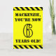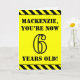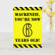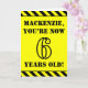 The front of this fun and attention-grabbing birthday-themed greeting card design features a personalized name and the message "YOU’RE NOW 6 YEARS OLD!" in black stencil look text on a yellow colored background. There is also an eye-catching black and yellow striped pattern at the top and bottom edges of the front. The inside features a customizable birthday greeting message, or could perhaps be cleared and left blank if a message is to be written by hand instead. A personalized birthday card like this might be a fun way to send a message in celebration of somebody’s sixth birthday. [~Z0000413]