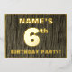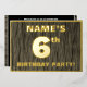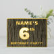 The front of this bold sixth birthday celebration foil invitation card features a customizable name, a large number “6th”, the message “BIRTHDAY PARTY!”, and a border, all in foil. The background of the front features a rustic, yet elegant, faux wood grain appearance inspired pattern. The back features personalized details about the event, such as the date, time, venue/location, and any other relevant information. Editable invitations like these might be used to invite attendees to a birthday party being held to honor somebody’s 6th birthday. [~Z0000598]