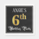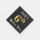 This luxurious and elegant birthday-themed paper napkin design features a personalized name and the message “6th Birthday Party”. The large number “6th” has a faux/imitation gold-inspired coloring pattern, the words “Birthday Party” are in fancy script-style text, and the background is colored black by default (although it can be customized). Fancy, opulent paper napkins like this might be useful to have at a birthday celebration being held to honor somebody’s 6th birthday. [~Z0000565]