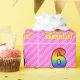 This upbeat and festive 6th birthday-themed wrapping paper design features a large number "6" having a colorful pattern inspired by the look of a rainbow spectrum. It also features the message "Happy 6th Birthday,", and a personalized name. The background features a pattern of dark pink and light pink stripes containing loving pink heart shapes. Birthday themed wrapping paper like this might be a fun way to wrap a gift or present being given to celebrate somebody’s sixth birthday. [~Z0000415]
