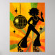 A vibrant retro‑inspired artwork featuring a dynamic disco dancer silhouette beside a shining disco ball. The bold radiating stripes in warm 70s colors create an energetic, groovy atmosphere that captures the spirit of the disco era. Perfect for fans of vintage aesthetics, dance culture, and colorful retro wall art.