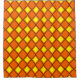 This shower curtain has a 1970s design of solid yellow diamonds inside brown diamond outlines on a field of orange.