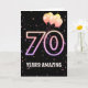 Party balloons and confetti on black background with the neon number 70 for a 70th birthday.