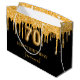 A chic black background. Decorated with faux gold glitter drips, paint dripping look. Personalize and add a name. With the text: Happy Birthday. The name is written with a mode hand lettered style script. Number 70 is written with a balloon style font.