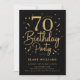 70th birthday party invitation in black and gold. Trendy modern design, perfect for a stylish men's or women's bday celebration. Features script font and confetti. Customize with your own details. Printed Zazzle invitations or instant download digital printable template.
