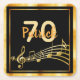 Black background with faux gold music notes for a 70th birthday party. With a faux gold frame. Templates for age and name. The name is written in a hand-lettered style script. Golden letters and number. For both him and her.