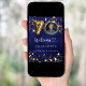 A welcome poster for a 70th birthday party. A navy blue background with elegant faux gold stars. The blue color is uneven. Personalize and add a photo, name and text. White letters.