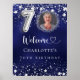 A welcome poster for a 70th birthday party. A navy blue background with elegant faux silver stars. The blue color is uneven. Personalize and add a photo, name and text. White letters.