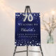 A welcome board for a 70th birthday party. A navy blue background with elegant faux silver stars. The blue color is uneven. Personalize and add a name and text. White letters.