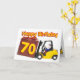 A forklift holds a parcel with the age on it in bright yellow letters. A cheery and funny birthday card for a man.