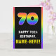 This vibrant and cheerful birthday-themed greeting card design features a big number “70“ having a multicolor rainbow spectrum inspired gradient pattern, along with the message “HAPPY 70th BIRTHDAY,”, and a custom recipient name. The inside features a customized birthday greeting message, or could perhaps be cleared and left blank if a message is to be written by hand instead. A joyful, customized birthday greeting card like this might be a fun way to send birthday greetings to somebody who is celebrating their seventieth birthday. [~Z0000636]