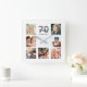 A wall clock as a gift for a 70th birthday for a woman, celebrating her life with a collage of 7 of your photos. Personalize and add a name, age 70 and a date. Date of birth or the date of the anniversary. Black and gray colored letters. A chic white background.