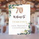A chic white background. Decorated with green watercolored eucalyptus leaves, sprigs, greenery, faux gold leaves. Personalize and add the name. Black and golden letters. Number 70 is written with a balloon style font.