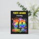 The front of this vibrant and exciting birthday party invitation postcard design features an editable name, a fun bursting celebratory fireworks inspired pattern, and the message "70 YEARS OLD!" having a colorful rainbow spectrum inspired gradient pattern. The back features an editable message that could include details about the birthday party, such as when it is happening and where it is being held. Invitation postcards like this could be sent to potential guests of a party being held to celebrate the birthday of somebody who is turning 70 years old. [~Z0000452]