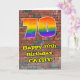 This exciting and vibrant urban street art and graffiti inspired birthday greeting card design features a large number “70” having a colorful rainbow spectrum gradient inspired pattern. It also features the message “Happy 70th Birthday,”, and a custom name. The background of the front features a brick wall pattern. The inside has a customizable birthday greeting message, or could perhaps be cleared and left blank if a message is to be written by hand instead. A colorful, customized birthday greeting card like this might be sent to celebrate somebody’s seventieth birthday. [~Z0000586]
