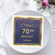 A napkin for an elegant blue and gold themed 70th birthday party. Templates for a name, age and date of the party. Golden colored letters. Midnight blue background color and a faux gold frame. With classic swirl decor and golden confetti rain, shower. The blue color is uneven like a fresco lime painted wall.