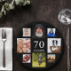 A paper plate for a 70 birthday party for a man, guy, celebrating his life with a collage of 8 of your own photos. Templates the age 70 and a date. Date of birth or the date of the party. White colored letters. Black background.