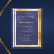 A trendy, modern 70th birthday party invitation card for men, guys, male. A dark blue, navy blue background. The blue color is uneven. With a faux gold frame and golden confetti sprinkle, golden colored letters. Templates for your party information.