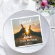 A napkin for a 70th birthday party for a guy. Photo of two hands holding bottles of beer against the evening sunset. Keep the photo or add yours. With the text: Cheers to, templates for a name age 70 and a date. Date of birth or the date of the party.