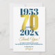 A modern and striking 70th birthday partyythank you card. This special milestone birthday card consists of birth and birthday date in blue typography - with the 70 highlighted in a gold effect font. Add a message for a custom party gift thank you.