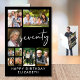 A keepsake jumbo 70th birthday card that features "seventy" in a chic script, a 9 photo collage of grandchildren and family, friends, pets, memories, travels, etc. and the recipient's name in simple white lettering on a black background. On the inside, add a personalized message or leave blank for a hand-written note.