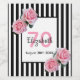 A label for a 70th birthday party. Classic slim black and white vertical stripes as background. With girly and feminine pink roses as decoration.