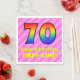 This happy and fun 70th birthday-themed paper napkin design features a large number "70" having a colorful rainbow spectrum inspired gradient pattern. It also features the message "Happy 70th Birthday,", followed by a custom name. The background features a pattern of light pink and dark pink stripes containing loving pink heart shapes. Birthday themed paper napkins like this might be fun to use at a celebration being held to honor somebody who is celebrating their 70th birthday. [~Z0000417]