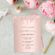 A modern, stylish and glamorous invitation for a woman's 70th birthday party. A faux rose gold metallic looking background with an elegant faux rose gold glitter drip, paint drip look. The name is written with a modern dark rose gold colored hand lettered style script. Templates for your party details.