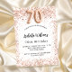 For an elegant 70th birthday. A white background. Decorated with rose gold, pink faux glitter, sparkles. Personalize and add a name, and party details. The name is written with a hand lettered style script, number 70 with balloon style fonts.
