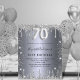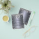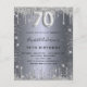 A modern, stylish and glamorous invitation for a 70th birthday party. A faux silver looking background, decorated with glitter dust. Personalize and add your name and party details. Number 70 is written with a balloon style font, script.