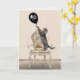 Gray tabby cat reaching for a black balloon on an old-fashioned chair for 70th birthday.