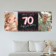 Milestone girly seventieth birthday party banner featuring a trendy black background, 2 large photos, pink sparkle glitter, 70 pink hellium balloons, and a custom celebration template that is easy to personalize.