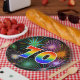 This fun, cheerful, and colorful paper plate design features a large number "70" containing a rainbow spectrum gradient inspired pattern coloring. It also features a vibrant and exciting bursting celebratory fireworks inspired pattern. It has a black colored background. Fun paper plates like this might be used at a celebration being held to observe somebody’s 70th birthday, a 70th anniversary, or some other seventieth event. [~Z0000490]