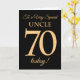 A chic 70th Birthday Card for a 'Very Special Uncle', with a number 70 composed of gold-effect numbers and the word 'Uncle', in gold-effect, on a black background. The inside message, which you can change if you wish, is 'Happy Birthday'